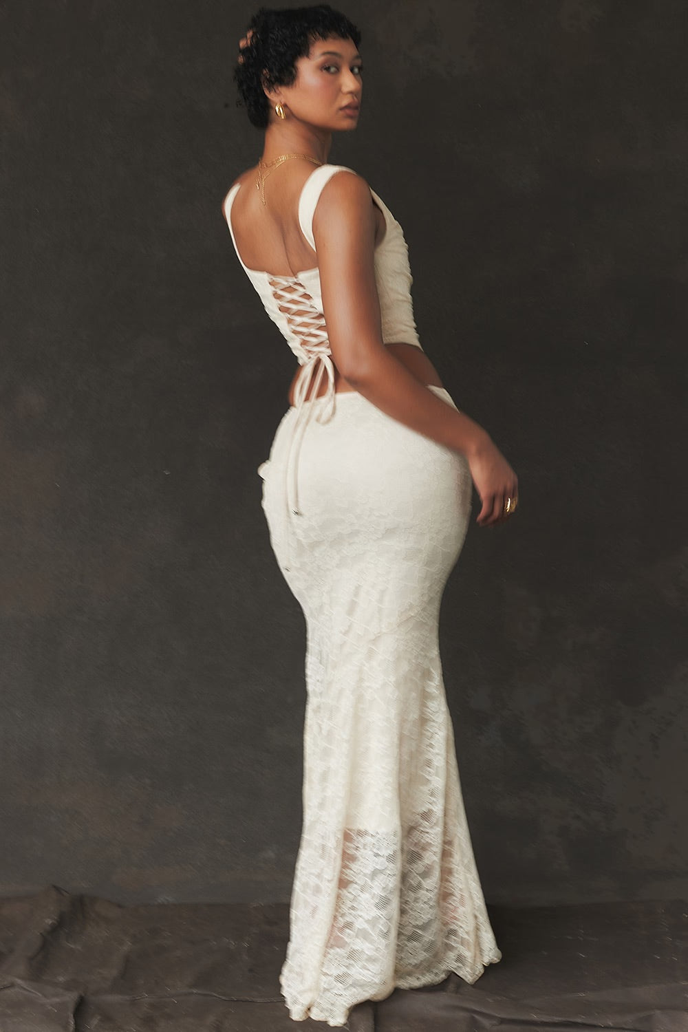 The maxi skirt perfectly captures elegant romance. It is made from beautiful, stretchy vintage cream lace with pretty floral patterns, sits low on the waist and drapes over the hips. It comes with a removable underskirt and matching briefs, so you can wear it with or without the underskirt. We love it without. The hem is simply gorgeous and flows as you walk. It opens at the side with a zipper for easy on and off.