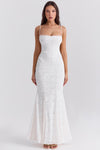 The dress hugs your figure and flows down in a floor-length maxi silhouette, opening into a glamorous godet skirt that showcases this beautiful gown perfectly.